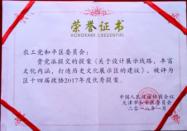 区委会的《设计展示线路 丰富文化内涵 打造历史文化展示区》和区委会委员、区政协委员刘力群的《关于和平区大数据应用的几点建议》两项提案被评为2017年度优秀提案,农工党党员沈连伟、刘力群、李杰、张威被评为2017年度优秀政协委员。(农工党天津市委会)