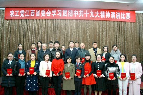 史可在致辞中指出,换届以来,新一届省委会始终高举中国特色社会主义伟大旗帜,坚定不移以习近平新时代中国特色社会主义思想为指导,自觉与以习近平同志为核心的中共中央保持高度一致,深入学习中共十九大精神,深入学习贯彻中共江西省委十四届五次全会精神,深入开展以“召开一系列学习会议,开辟一系列学习专栏,举办一次演讲比赛,举办一场专题辅导报告会,组织一次主题宣讲,开展一次主题征文,推出一批理论文章”为主要内容的学习贯彻中共十九大精神“七个一”系列活动,扎实开展“不忘合作初心、继续携手前进”政治交接专题学习教育活动,进一步增强了全省广大党员的政治意识、大局意识、核心意识、看齐意识,坚定了道路自信、理论自信、制度自信、文化自信,成效显著。史可强调,学习贯彻中共十九大精神演讲比赛,既是省委会深入学习贯彻中共十九大精神“七个一”活动和开展“不忘合作初心、继续携手前进”政治交接专题学习教育活动的具体举措,也是检验全省组织和广大党员开展“七个一”学习贯彻活动实际成效的重要载体,更是以习近平新时代中国特色社会主义思想为指导,谋划部署2018年农工党全省工作的有效延伸。他希望选手们发挥自身水平,用自己的真情实感,抒发对中国共产党的满腔热爱之情,表达农工党全省组织和广大党员“学习中共十九大、不忘初心跟党走”的坚定信念和决心。