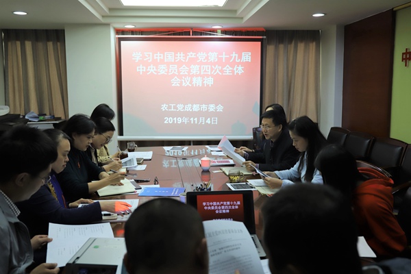 2019年11月4日,农工党成都市委会召开专题会议,传达学习中共十九届四中全会精神。农工党四川省委会副主委、成都市委会主委甘华田主持学习。市委会秘书长曾琪、市委会机关副巡视员杨红参加了会议。