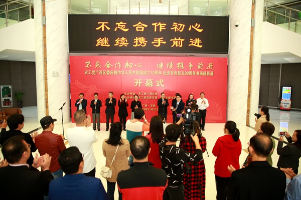 农工党广西区委会主委蒋和生出席开展仪式并宣布书画摄影展开展,中共百色市委统战部副部长、市台办主任黄岭莹,农工党广西区委会专职副主委何玉庭出席开展仪式并致辞,百色市政协副主席韦晓东、农工党广西区委会副主委农海波、覃建宁、何敏,农工党广西区委会秘书长庞文斌,农工党百色市委会主委周永尧,百色市图书馆副馆长卢林春出席开展仪式。农海波主持开展仪式。